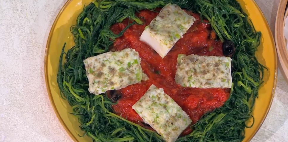 Prendiamo il filetto di baccalà e spalmiamo sopra la farcitura preparata. Lo compattiamo e mettiamo a cuocere il tutto nella vaporiera per 15 minuti (possiamo anche dividerlo in più trancetti).