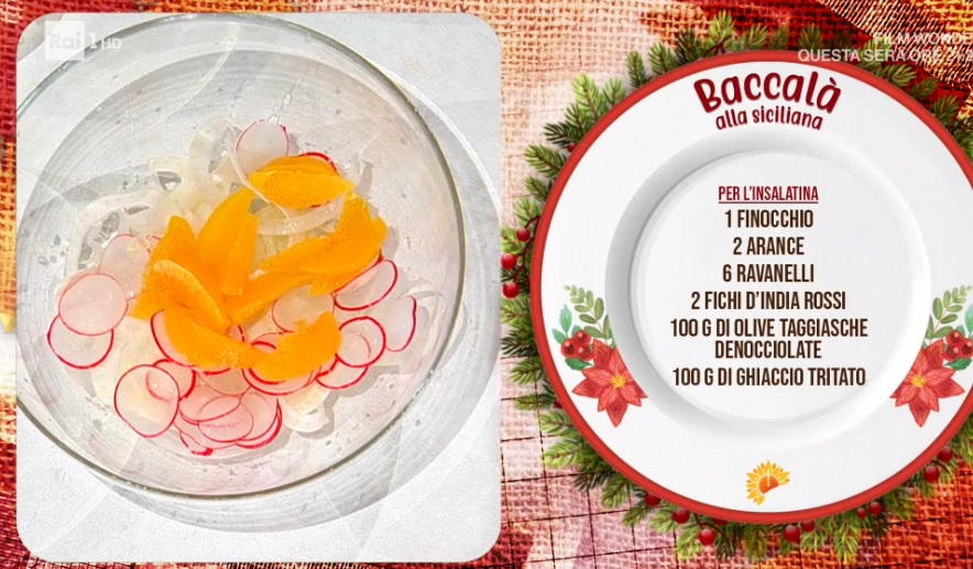 - Insalata: 1 finocchio, 2 arance, 6 ravanelli, 2 fichi d’india, 100 g olive taggiasche, 100 g ghiaccio