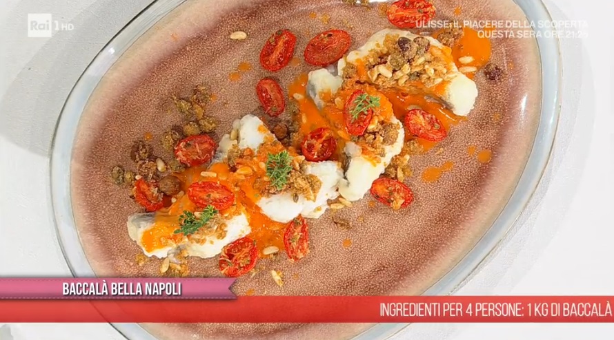 baccalà bella NapoliMauro Improta, insieme al figlio, riporta in cucina la solarità e la tradizione culinaria della splendida Campania. Nel dettaglio, il cuoco partenopeo propone un secondo piatto a base di baccalà (merluzzo sotto sale). Ecco il baccalà bella Napoli.