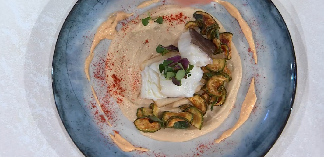 Sul piatto, formiamo un letto di hummus, adagiamo sopra le zucchine marinate, la polenta grigliata e finiamo con il baccalà e la maionese di baccalà.
