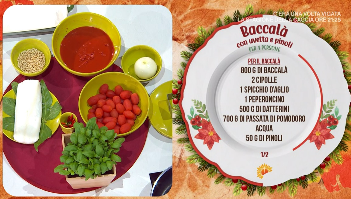 - 800 g baccalà, 2 cipolle, 1 spicchio d’aglio, 1 peperoncino, 500 g datterini, 700 g passata di pomodoro, acqua, 50 g pinoli, 50 g uvetta, 100 g farina di riso, 1 l olio per friggere, timo, 10 foglie di basilico, sale e pepe
