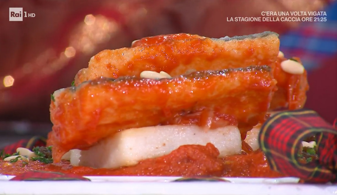Serviamo il baccalà su una fetta di polenta rosolata in padella, con abbondante sugo.