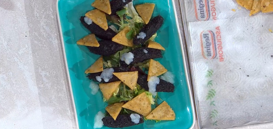 Passiamo al baccalà. Nel mixer, frulliamo il pane in cassetta con il nero di seppia. Distribuiamo il composto ottenuto su una teglia e lo mettiamo in forno caldo a 50° per circa 20 minuti. Quando il pane è secco, lo polverizziamo con il mixer.