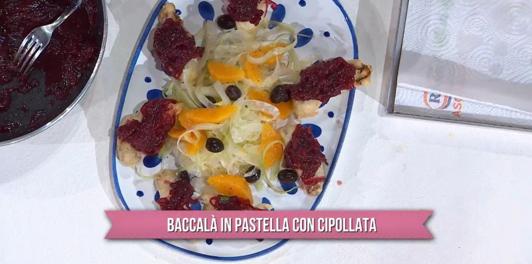 baccalà in pastella con la cipollata di Fabio PotenzanoUna boccata d’aria buona, di mare, di Sicilia, con Fabio Potenzano. Il cuoco bagherese, dopo aver salutato in collegamento video una telespettatrice che ha replicato un suo piatto, prepara il baccalà in pastella con la cipollata.