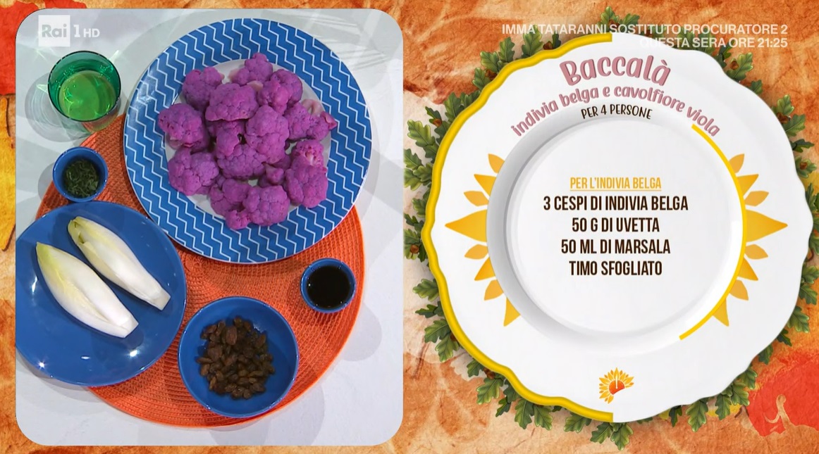 Affettiamo sottilmente l’indivia belga, per il lungo, quindi la scottiamo in padella con un filo d’olio. Dopo qualche istante, uniamo l’uvetta rinvenuta nel Marsala e profumiamo con il timo.