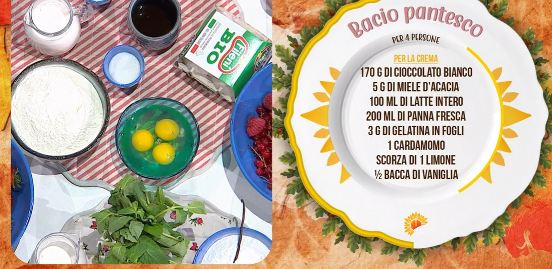 - Crema: 170 g cioccolato bianco, 5 g miele d’acacia, 100 ml latte, 200 ml panna, 3 g gelatina in fogli, 1 cardamomo, scorza di 1 limone, bacca di vaniglia