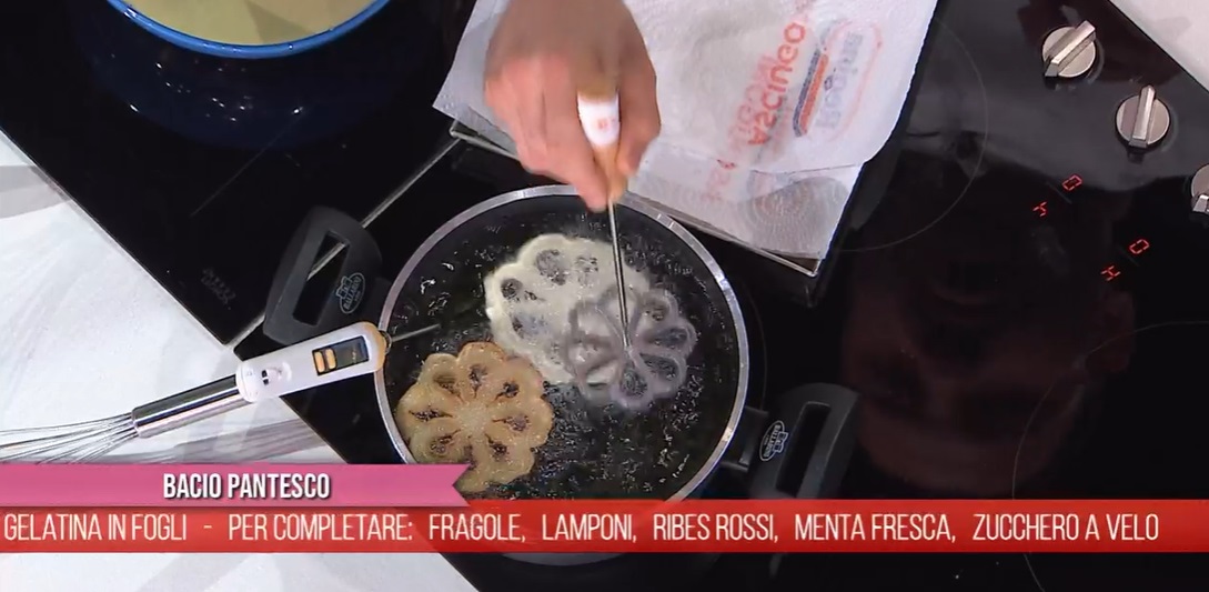 Scaldiamo l’olio, immergiamo lo stampino nell’olio caldo, quindi subito nella pastella (senza sporcare la parte superiore), immergiamo nuovamente e velocemente nell’olio caldo ed aspettiamo che si stacchi la pastella. Lasciamo friggere fino a doratura. Scoliamo su carta assorbente.