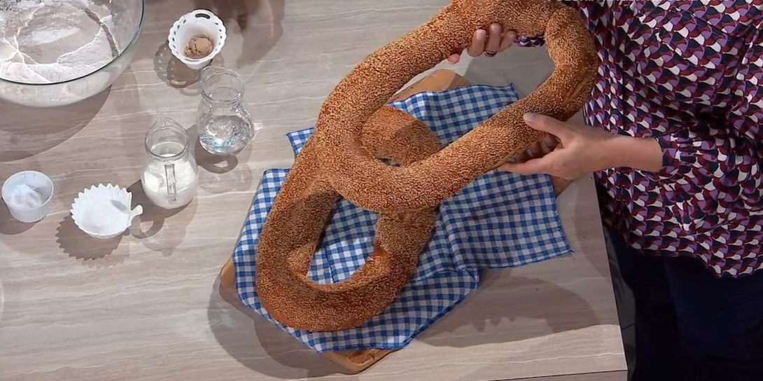 Dividiamo l’impasto in due parti e, con ciascuna, formiamo un serpentello lungo circa 1 m e lo chiudiamo a ciambella. Lo spennelliamo con poca acqua e bicarbonato (mezzo l acqua, 2 cucchiai di bicarbonato) e lo spolveriamo con i semi di sesamo. Copriamo e lasciamo lievitare ancora per 2 ore a temperatura ambiente. Cuociamo in forno caldo e statico a 220° per 10 minuti; abbassiamo a 200° per altri 10 minuti.