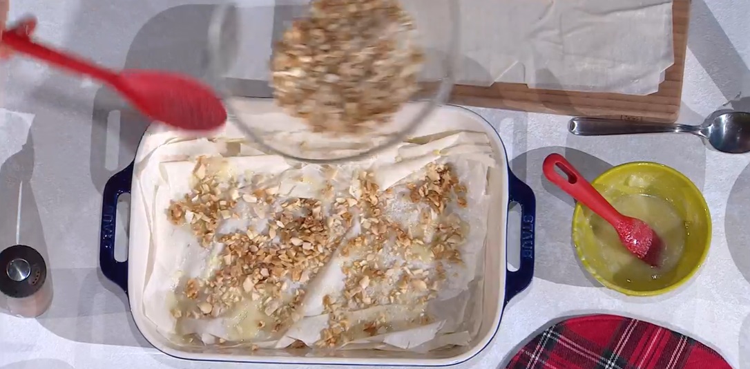Alla base di un pirofila, sovrapponiamo 7 sfoglie di pasta fillo, spennellando ciascuna con del burro fuso. Distribuiamo sopra metà della frutta secca condita. Copriamo con un foglio di pasta fillo, spennelliamo con burro e distribuiamo sopra la frutta secca rimasta. Finiamo con uno strato di pasta fillo, che spennelliamo con il burro. Ritagliamo a rombi, con un spatola. Cuociamo in forno caldo e statico a 180° per 25 minuti.
