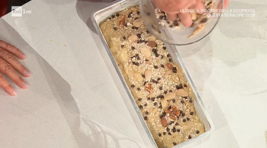 Trasferiamo l’impasto all’interno dello stampo da plumcake imburrato ed infarinato. Distribuiamo sopra il mix di frutta secca e avena con le gocce di cioccolato e cuociamo in forno caldo a 190° per 10 minuti; poi, abbassiamo a 170° e lasciamo cuocere altri 25 minuti.