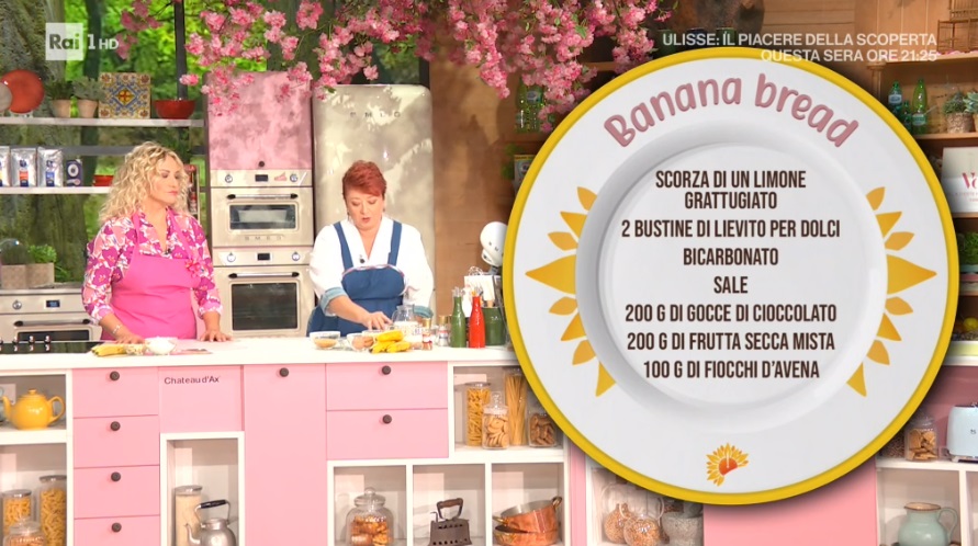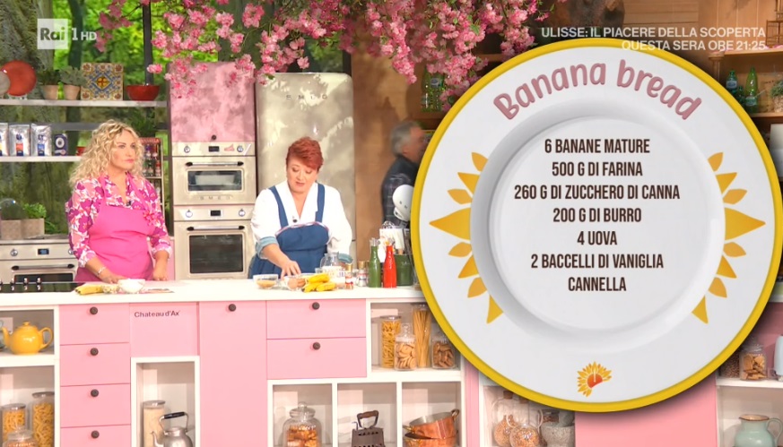 banana bread di zia CriEd è ancora mezzogiorno, con Antonella e con la solare zia Cri. La cuoca romagnola, in apertura di puntata, propone un dolce per la colazione ‘american style’. A sceglierlo è Costantino Della Gherardesca, ballerino per Milly Carlucci, conduttore per Rai2. Vediamo come preparare il banana bread.