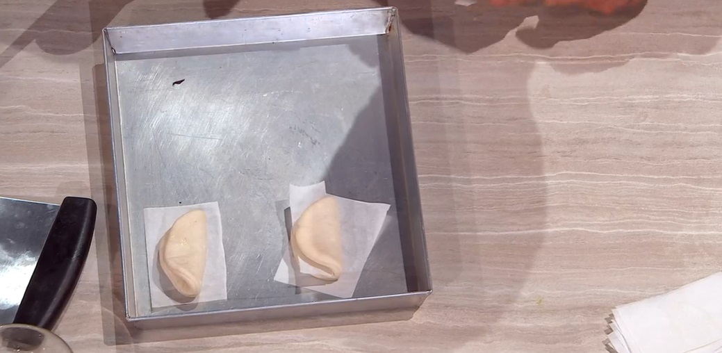 Mettiamo un rettangolino di carta forno su una metà del dischetto e lo ripieghiamo, a mezzaluna, senza pressare. Oppure, ungiamo la superficie del dischetto e ripieghiamo a mezzaluna. Posizioniamo ogni panino su un rettangolo di carta forno e lasciamo lievitare ancora 20 minuti.