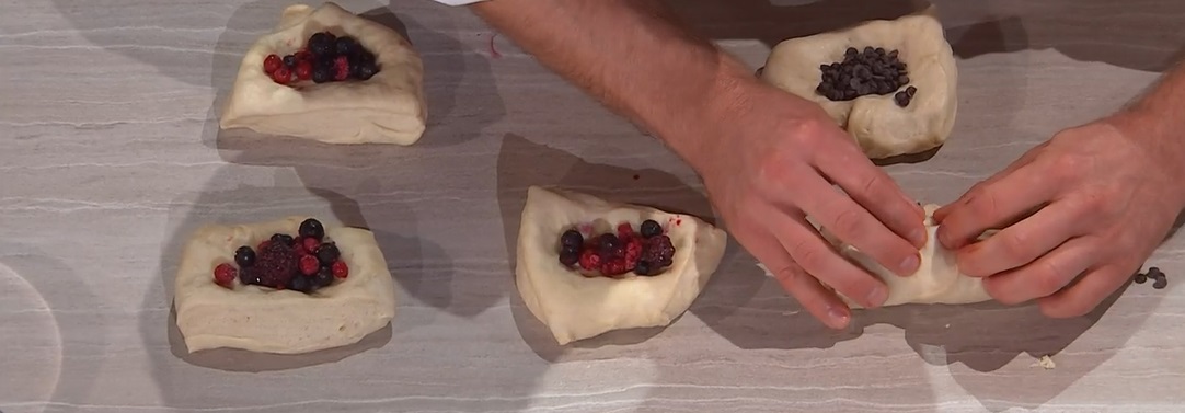 Dividiamo l’impasto lievitato in panetti e creiamo un incavo al centro di ognuno. Riempiamo l’incavolo con frutti di bosco congelati e gocce di cioccolato. Richiudiamo l’impasto sul ripieno, pizzicandolo al meglio. Diamo la forma di bauletti, che disponiamo su una teglia con carta forno, rivolgendo la congiuntura verso il basso. Copriamo e lasciamo lievitare per 2 ore a temperatura ambiente. Possiamo anche inserirli in stampini di carta forno per mini plumcake.