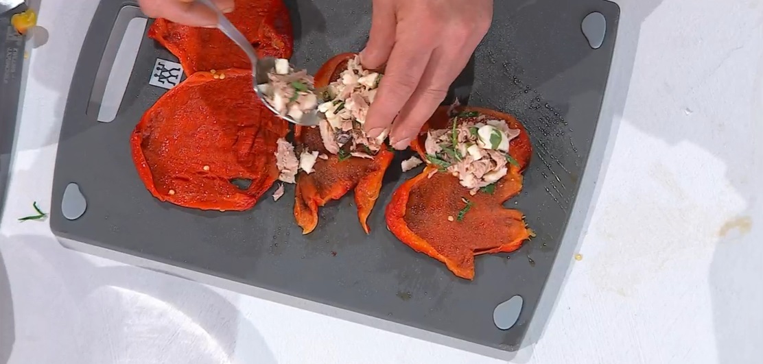 Sulle verde di peperone, mettiamo un po’ di ripieno, quindi arrotoliamo il peperone sul ripieno, in modo da creare degli involtini. Sbollentiamo l’erba cipollina per 1 minuto, quindi la scoliamo. Leghiamo gli involtini con erba cipollina. Possiamo scegliere se servirli freddi oppure spolverare di pangrattato e passarli in forno, funzione grill.