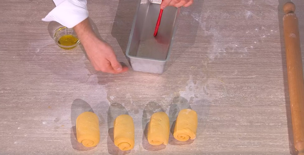 Con il mattarello, stendiamo ogni filoncino, formando delle lingue, che arrotoliamo su lo stesse, formando delle chiocciole. Le inseriamo all’interno di uno stampo per pane in cassetta lung0 circa 30 cm ben oliato. Copriamo e lasciamo lievitare per 2 ore a temperatura ambiente.