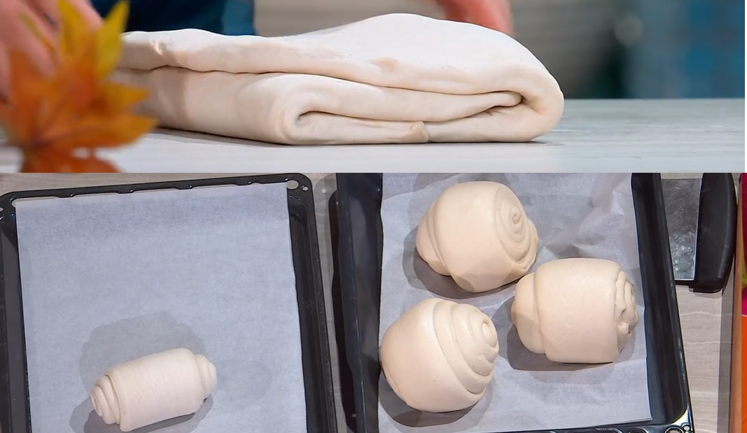 Dividiamo il rettangolo (piegato) in 4 strisce. Appiattiamo ogni striscia con il mattarello, in modo da formare una lingua lunga e sottile circa mezzo cm. Arrotoliamo la lingua su se stessa, ben stretta, a formare una chiocciola. Posizioniamo sulla teglia, copriamo e lasciamo lievitare ancora 2 ore a temperatura ambiente.