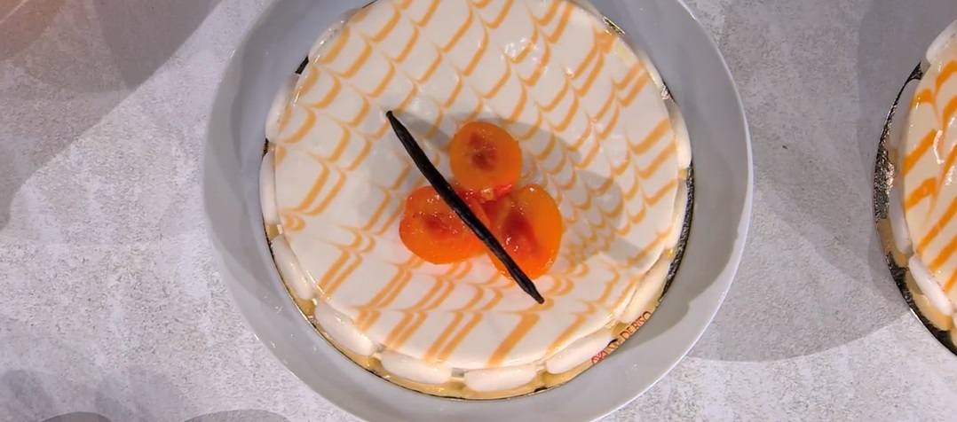 Inserto: tagliamo le albicocche a metà e le disponiamo su una teglia. Le cospargiamo con abbondante zucchero vanigliato e le mettiamo in forno caldo a 140° per 35 minuti. Le sforniamo, le lasciamo raffreddare e le frulliamo con un mixer ad immersione, aggiungendo l’amaretto di Saronno e della gelatina reidratata. Versiamo il composto all’interno di uno stampo rotondo, adagiamo sopra un disco di pan di Spagna inzuppato con bagna alla vaniglia o amaretto e congeliamo.