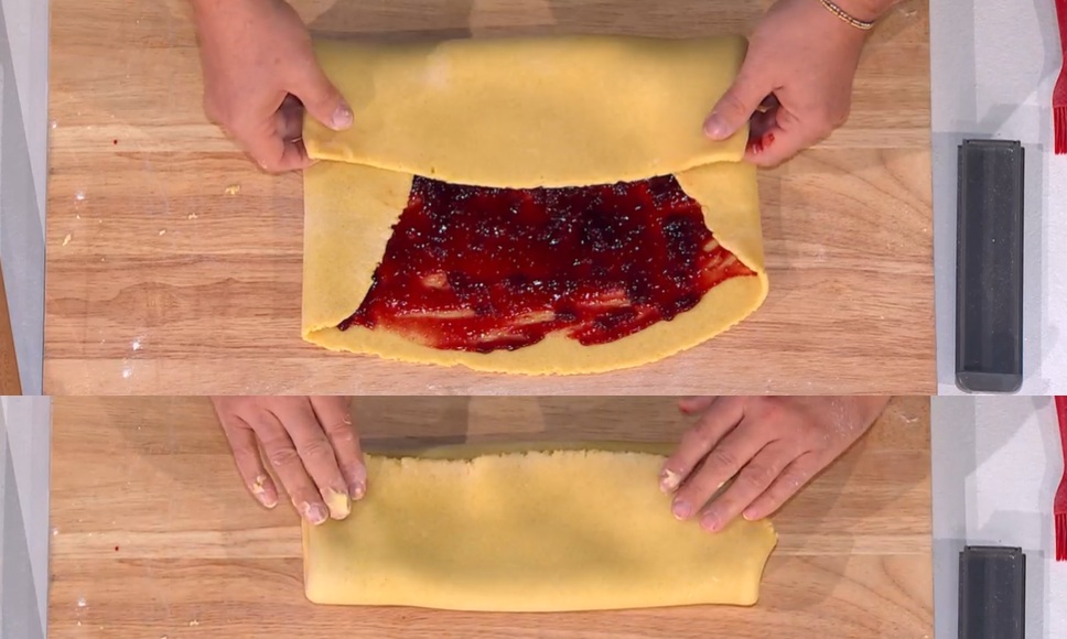 Con il mattarello, stendiamo l’impasto sul piano infarinato, creando un rettangolo spesso mezzo cm. Spalmiamo sopra la confettura scelta, quasi fino ai bordi. Ripieghiamo i lati corti sulla confettura, quindi diamo una piega a 3, a portafoglio (foto).