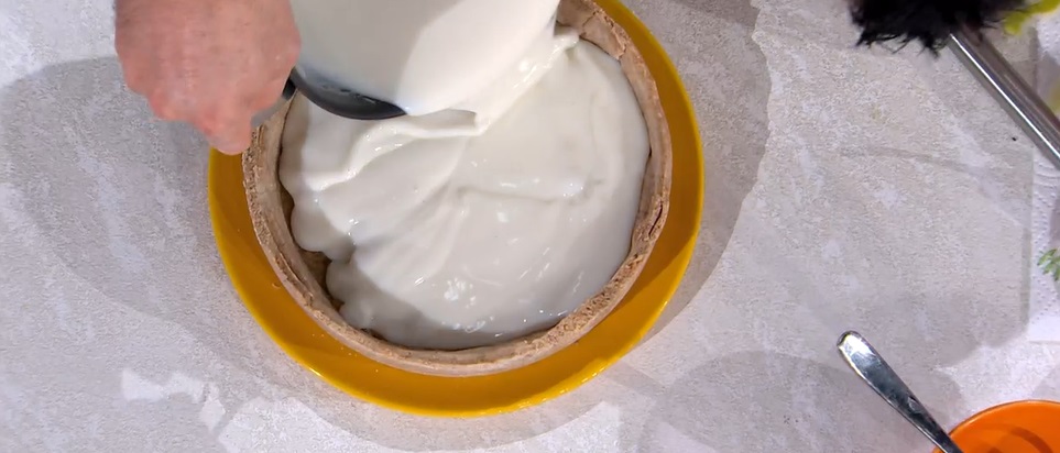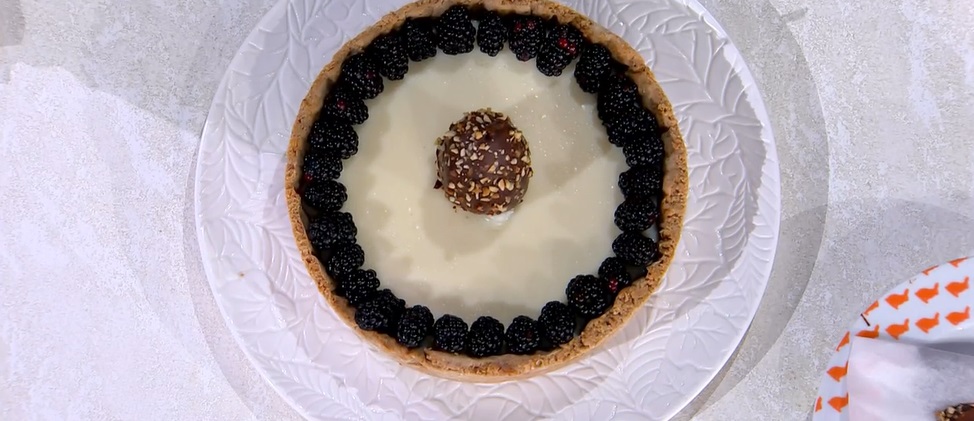 All’interno del guscio di frolla ormai freddo, distribuiamo le pere a dadini. Versiamo sopra la crema ancora calda, arrivando al bordo della frolla. Lasciamo raffreddare in frigorifero. Decoriamo la superficie con le more e la pera intera sciroppata ed immersa nel cioccolato fuso con granella di nocciole.