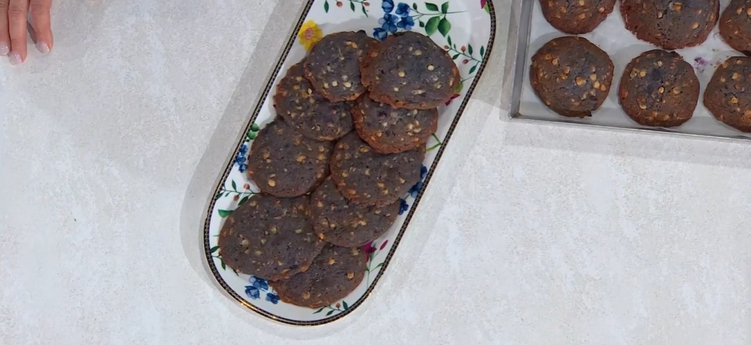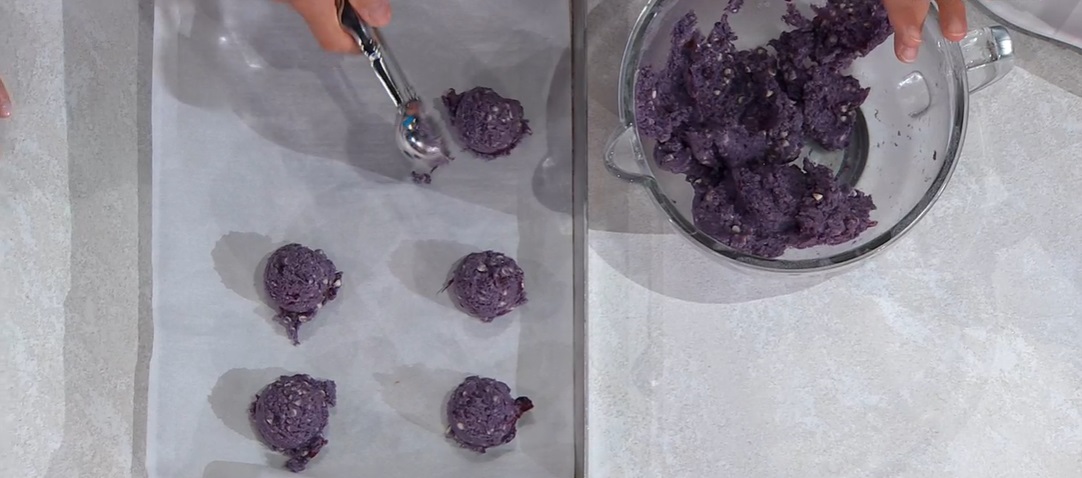 Con lo ‘spallinatore’ per gelato, preleviamo delle palline di impasto, che disponiamo su una teglia con carta forno, ben distanziate. Rimettiamo in frigorifero per mezz’ora, quindi inforniamo da fredde in forno caldo e statico a 190° per 20 minuti.