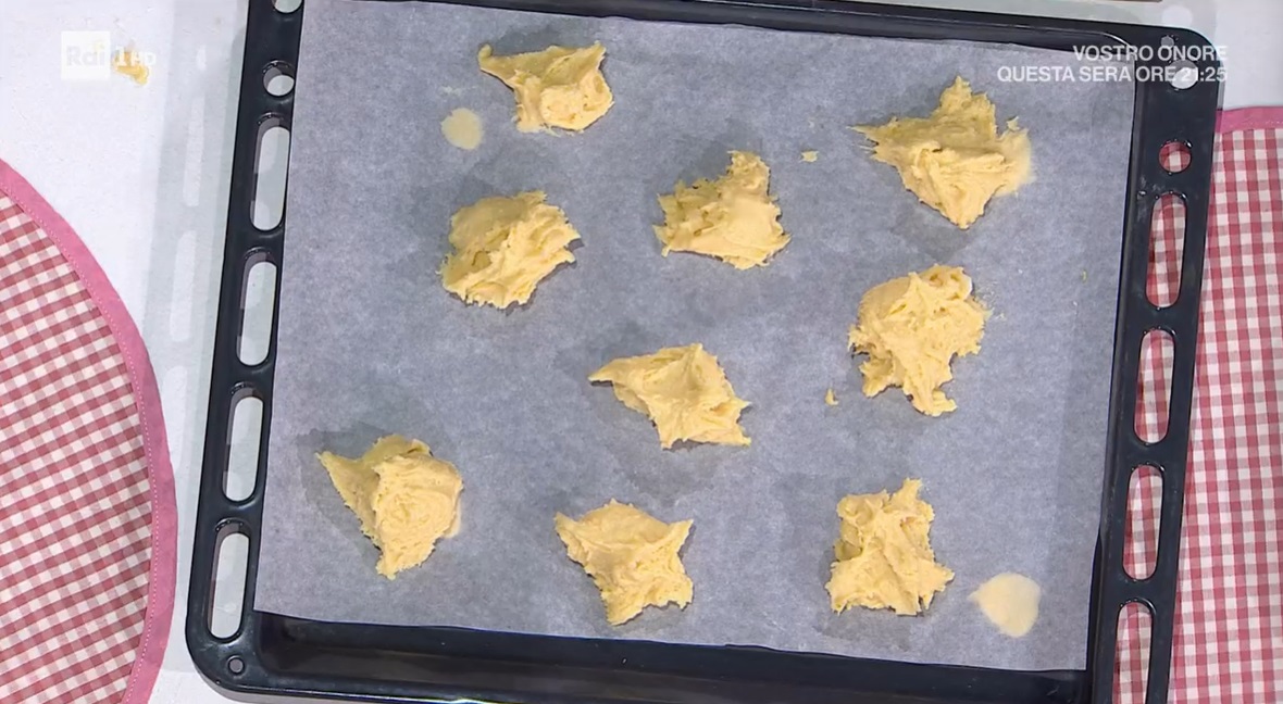 Con una mano, sulla teglia con carta forno, formiamo dei mucchietti di impasto (irregolari). Spennelliamo con poco latte e spolveriamo con zucchero semolato. Cuociamo in forno caldo e statico a 180° per 12-15 minuti.