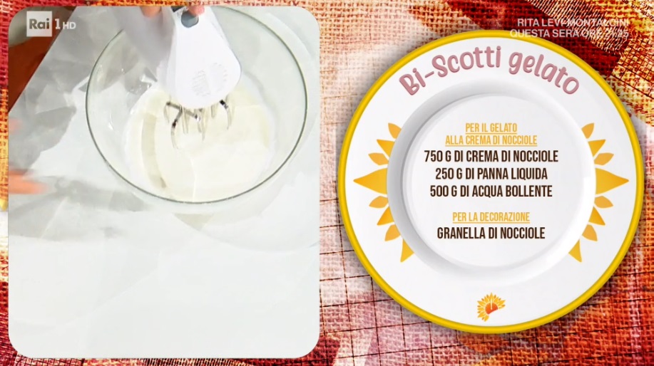 - Gelato: 750 g crema di nocciole, 250 g panna, 500 g acqua bollente, granella di nocciole
