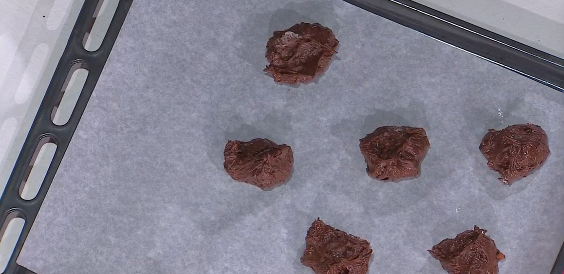 Su una teglia con carta forno, aiutandoci con due cucchiai, formiamo dei mucchietti di impasto. Cuociamo in forno caldo e statico a 170° per 12-13 minuti.