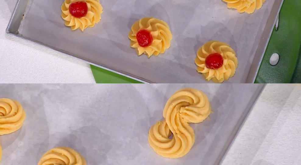Su una teglia con carta forno, ‘stampiamo’ i biscotti, disegnando delle rosette o delle S (foto). Decoriamo ogni biscotto con frutta secca o ciliegie candite. Cuociamo in forno caldo e statico a 170° per 15-20 minuti.