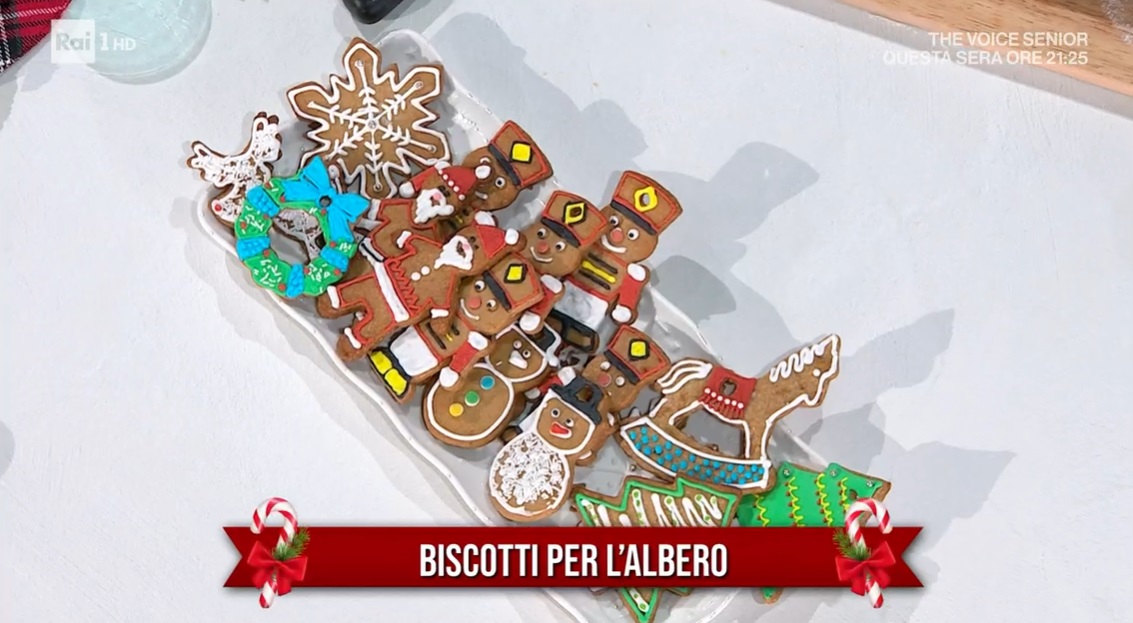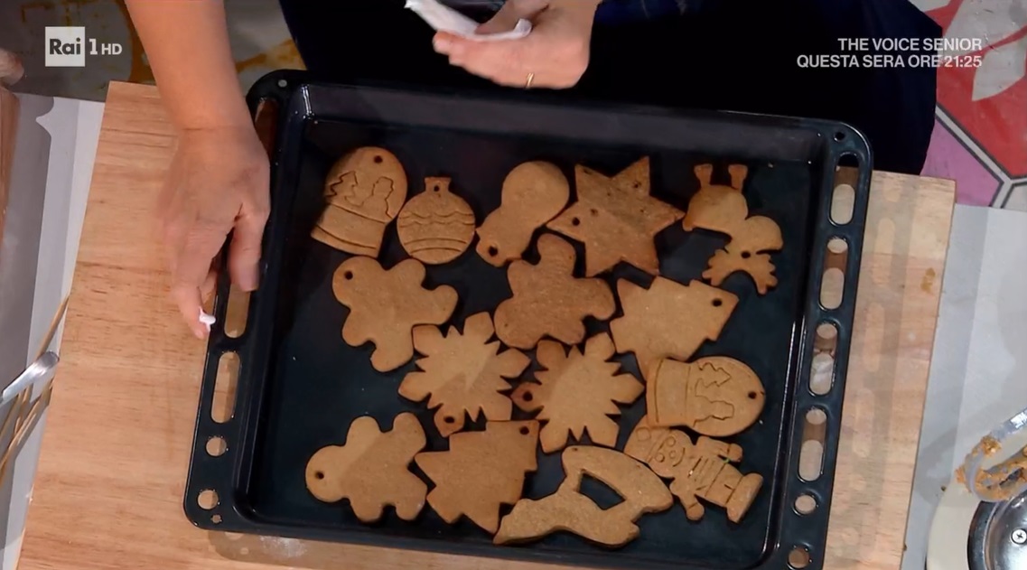 Stendiamo l’impasto con il matterello, ad uno spessore di circa mezzo cm. Ritagliamo le forme che vogliamo, con apposite formine. Li posizioniamo sulla teglia con carta forno, pratichiamo un foro in un punto per poterli appendere successivamente e li cuociamo in forno caldo e statico a 180° per circa 10-15 minuti, o fino a leggera doratura.