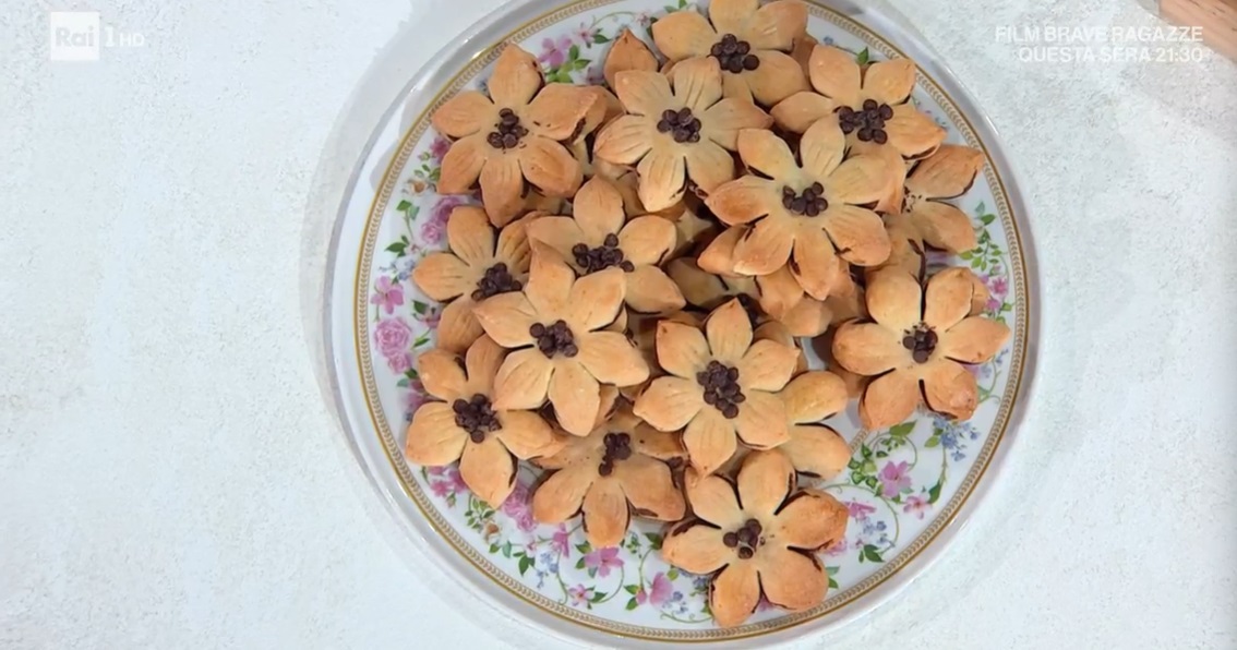 Dividiamo l’impasto chiaro e quello scuro in 18 porzioni. Appiattiamo le palline chiare con il mattarello o la mano, in modo da ottenere dei dischi sottili e posizioniamo al centro la pallina al cacao. Avvolgiamo quest’ultima nell’impasto chiaro. Schiacciamo nuovamente con la mano, quindi incidiamo i lati, formando 6 petali. Pizzichiamo ogni lembo tra polline e indice, creando le punte dei petali (foto). Pressiamo leggermente al centro del fiore, spennelliamo con il latte e riempiamo l’incavo con delle gocce di cioccolato.