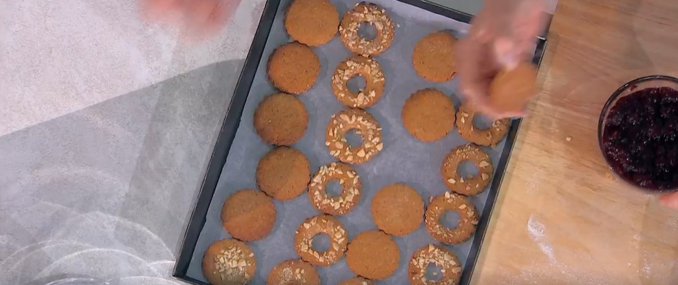 Stendiamo il panetto ad uno spessore uniforme (in modo tutti i biscotti abbiano lo stesso tempo di cottura) e ritagliamo I biscotti con formine a piacere. Li mettiamo su una placca foderata con carta forno, ad alcuni facciamo un foro centrale. Li spennelliamo con acqua, guarniamo con granella di mandorle. Inforniamo a 180⁰ per 15 minuti. Farciamo con marmellata senza zucchero quelli con il foro centrale, accoppiandoli ad altri dischi integri (sono gli occhi di bue).