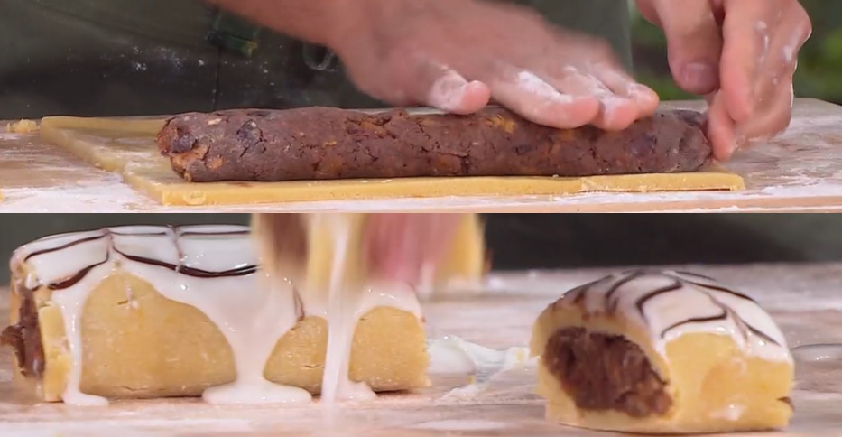 Glassiamo: mescoliamo abbondante zucchero a velo con l’albume, fino ad ottenere una crema fluida. La spalmiamo sul biscottone ancora crudo. Creiamo sopra dei decori con del cioccolato fuso. Tagliamo a fette spesse circa 3-4 cm, ottenendo dei biscotti che posizioniamo su una placca foderata con carta forno. Inforniamo a 180⁰ per circa 15/18 minuti.