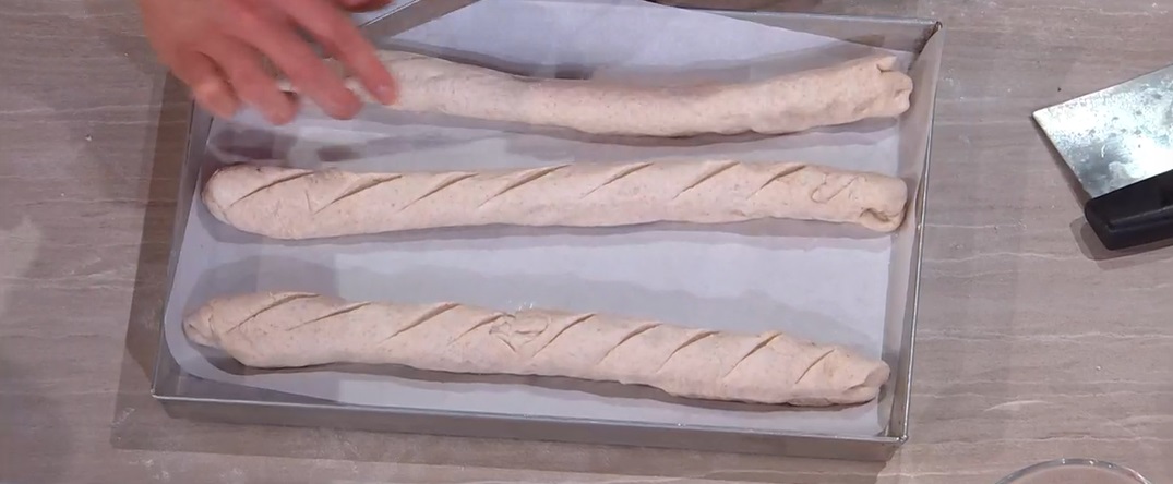 Con le mani, schiacciamo ogni filoncino, rendendolo un rettangolo spesso 1 cm. Arrotoliamo quest’ultimo su se stesso, partendo dal lato lungo. Posizioniamo i filoncini ottenuti su una teglia e pratichiamo le incisioni (foto). Copriamo e lasciamo lievitare 1 ora a temperatura ambiente e 4 ore in frigorifero.