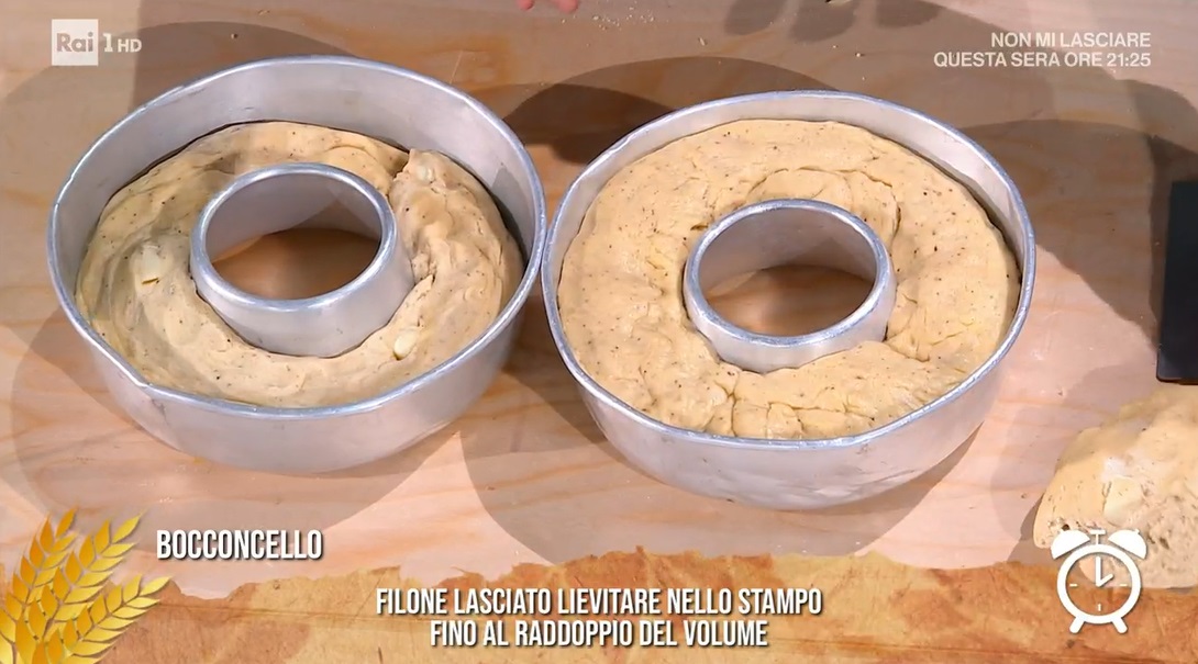 Dividiamo l’impasto in due parti uguali, per due teglie da ciambella da 30 cm di diametro. Prendiamo ciascun panetto, lo allunghiamo a formare un filone, quindi lo chiudiamo a ciambella e lo inseriamo all’interno dello stampo unto. Copriamo e lasciamo lievitare fino al raddoppio: l’impasto deve raggiungere quasi i bordi dello stampo.