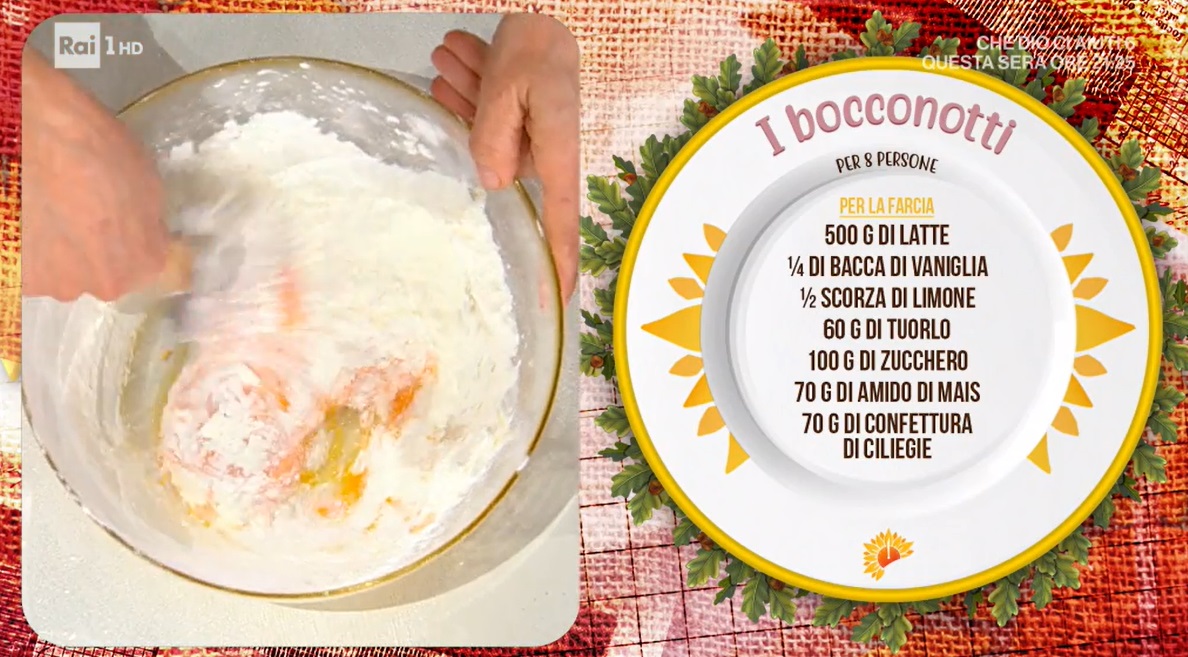 - Crema: 500 g latte, 1/4 bacca di vaniglia, mezza scorza di limone, 60 g tuorlo, 100 g zucchero, 70 g amido di mais, 70 g confettura di ciliegie