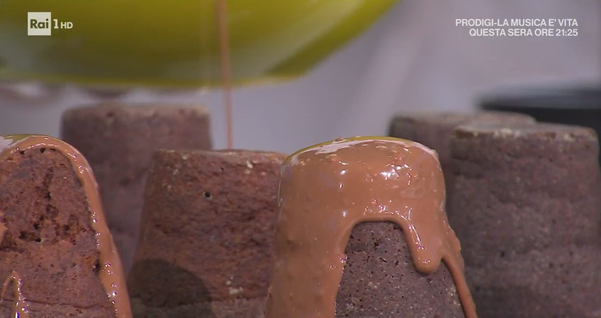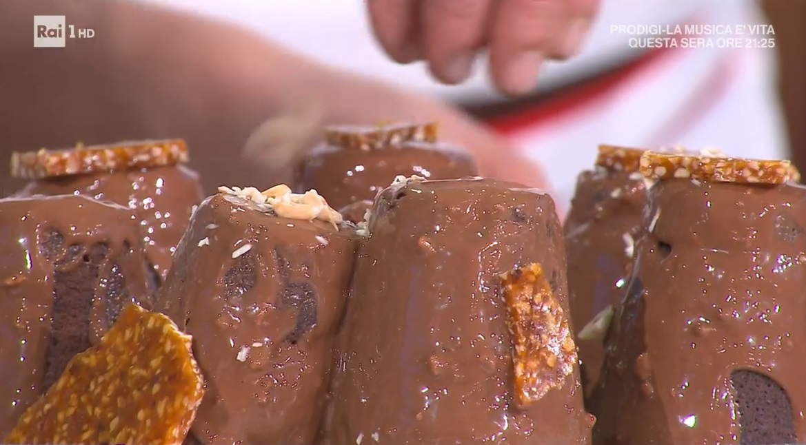 Coliamo la glassa sui tortini ormai freddi. Lasciamo indurire, quindi decoriamo con il croccante di nocciole.