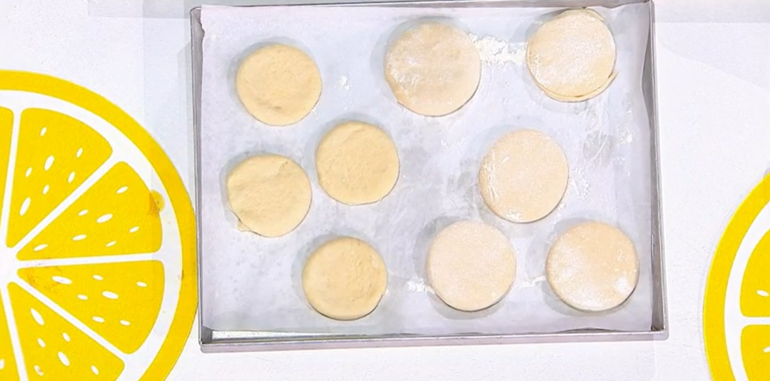 Copriamo e lasciamo lievitare a temperatura ambiente fino al raddoppio. Trasferiamo sul piano infarinato e stendiamo con il mattarello ad uno spessore di 1-2 cm. Ritagliamo dei dischi di circa 8-10 cm di diametro. Li disponiamo su una teglia con carta forno, copriamo con la pellicola e lasciamo lievitare ancora 20 minuti.