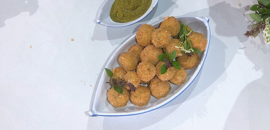 Con il risotto freddo, formiamo delle palline grandi come noci, le passiamo nella pastella di riso e mais, quindi le rotoliamo nella granella di gallette. Le immergiamo in olio caldo e profondo e lasciamo friggere fino a doratura. Scoliamo su carta assorbente. Le friggiamo con anticipo e le teniamo al caldo in forno caldo e socchiuso a 110°.