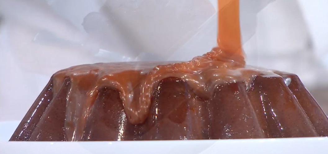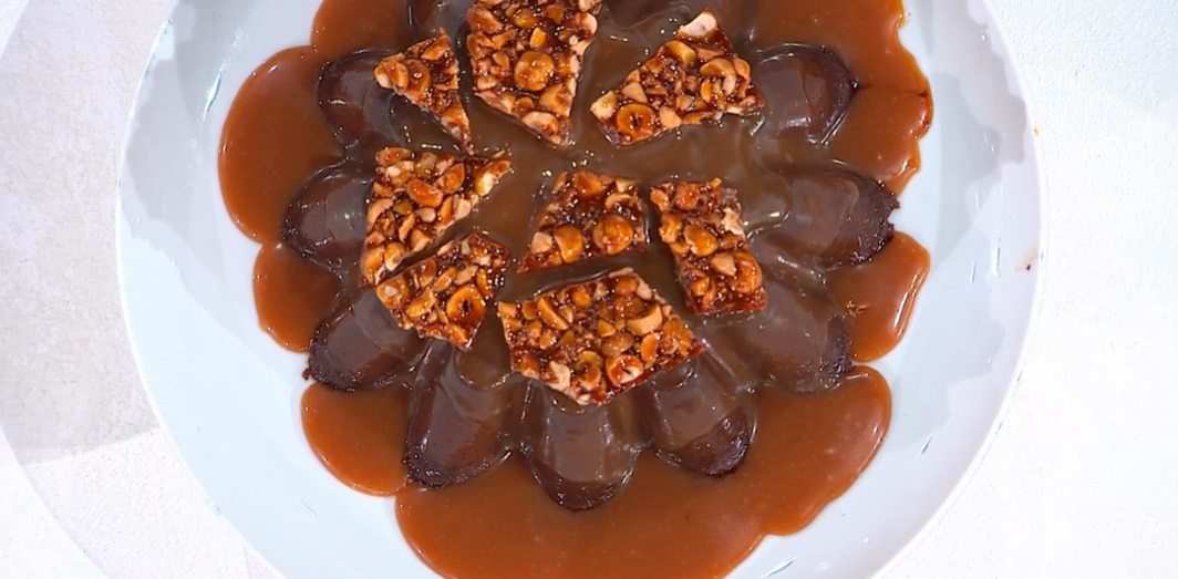 Capovolgiamo il bonet sul piatto a portata e coliamo sopra la salsa mou. Serviamo con il croccante di nocciole.