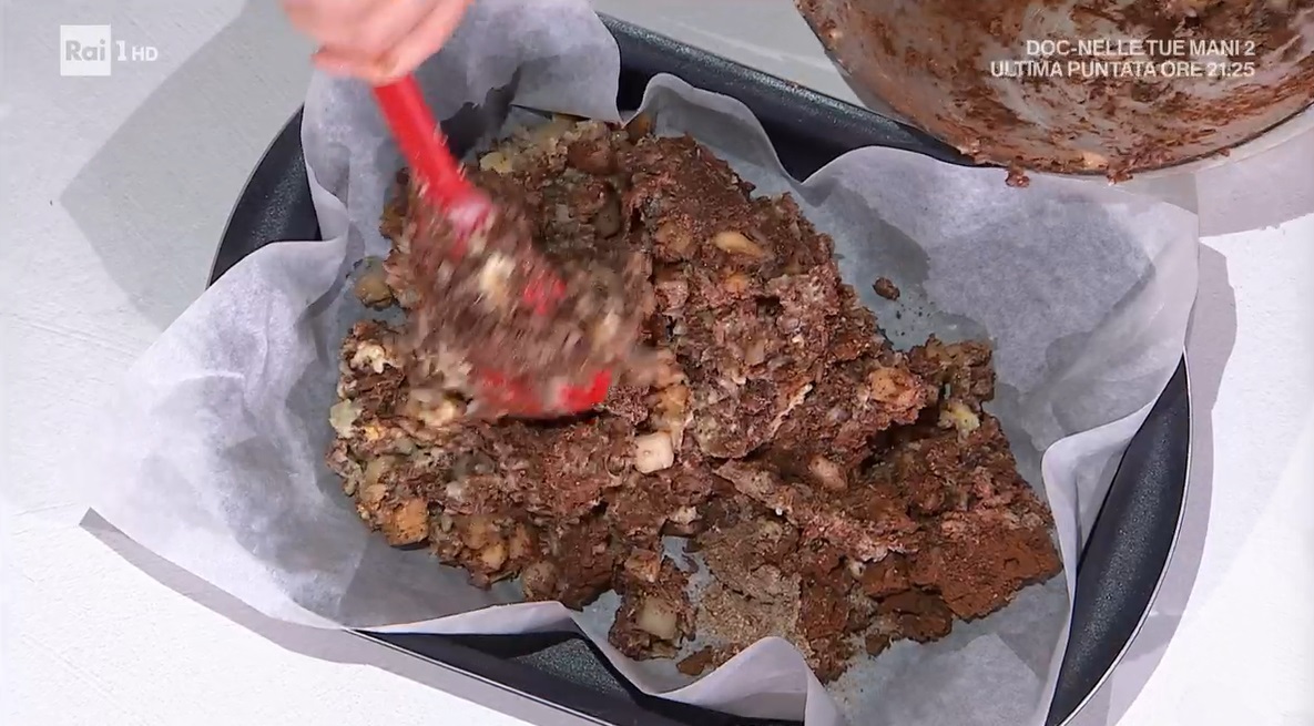 Trasferiamo l’impasto all’interno di una teglia foderata con carta forno. Livelliamo e facciamo cuocere in forno caldo e statico a 150° per 1 ora.
