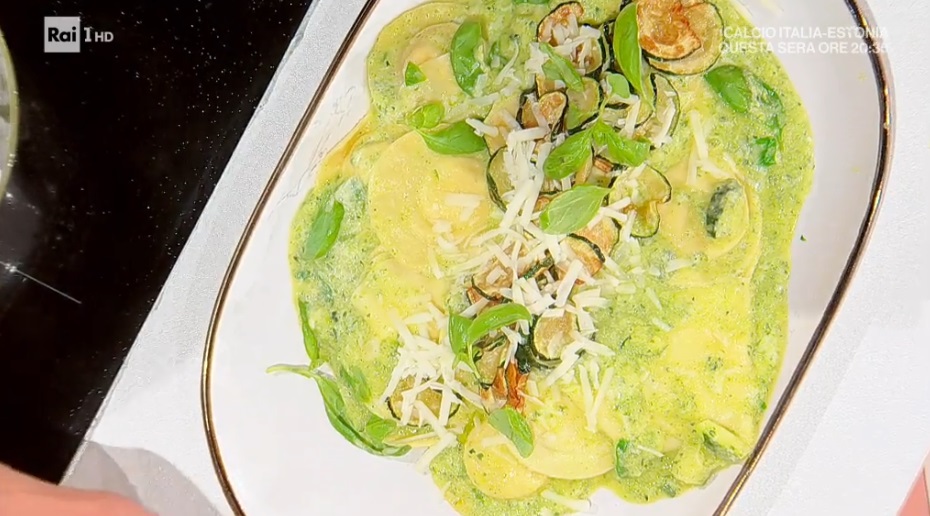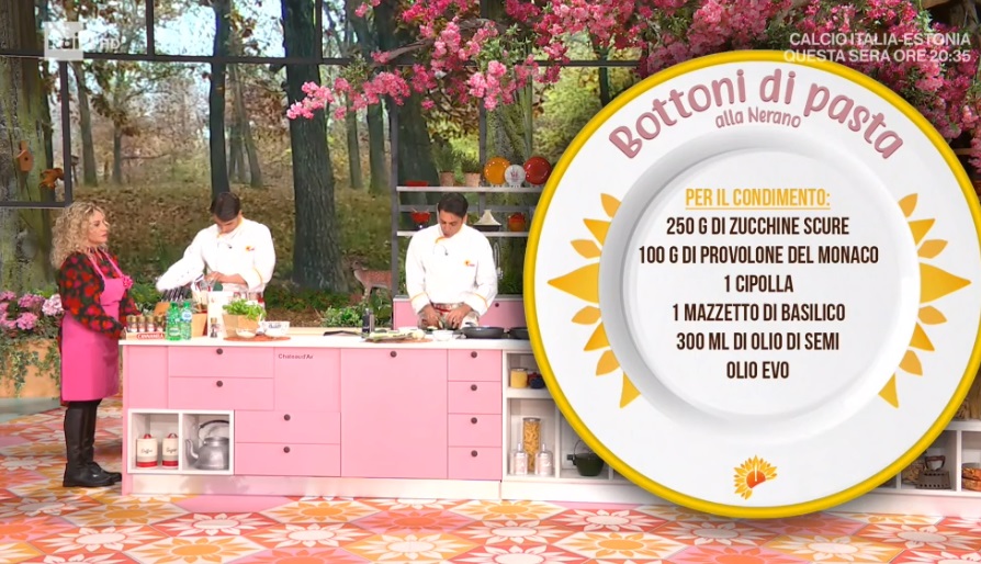 In una padella, facciamo soffriggere la cipolla tritata con un filo d’olio. Aggiungiamo l’altra parte delle zucchine a cubetti e lasciamo soffriggere, poi le frulliamo e uniamo il provolone grattugiato, il basilico spezzettato e amalgamiamo bene. Condiamo i bottoni di pasta con la crema di zucchine e serviamo decorando con le zucchine fritte.