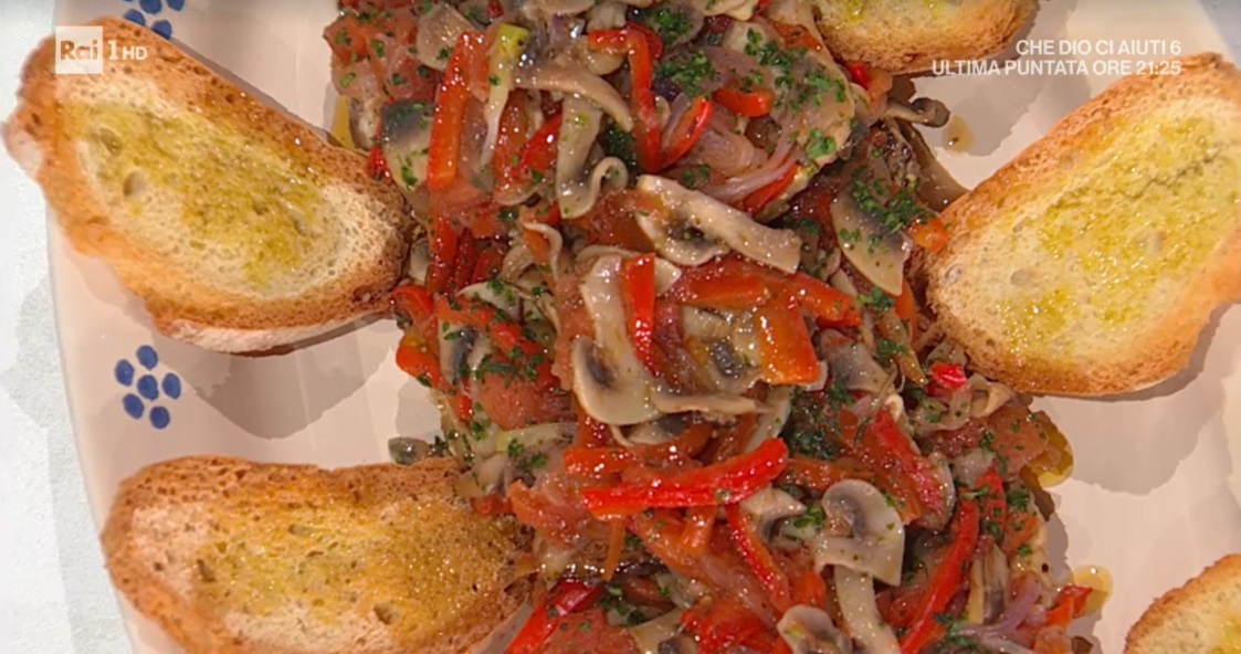 In padella, scaldiamo un generoso filo d’olio con aglio, rosmarino e salvia. Quando l’olio si è profumato, togliamo aglio ed erbe e mettiamo a soffriggere i funghi freschi affettati finemente. Facciamo cuocere a fiamma alta qualche secondo, quindi uniamo i peperoni puliti e tagliati a listarelle, la cipolla affettata e qualche falda di pomodoro pelato.