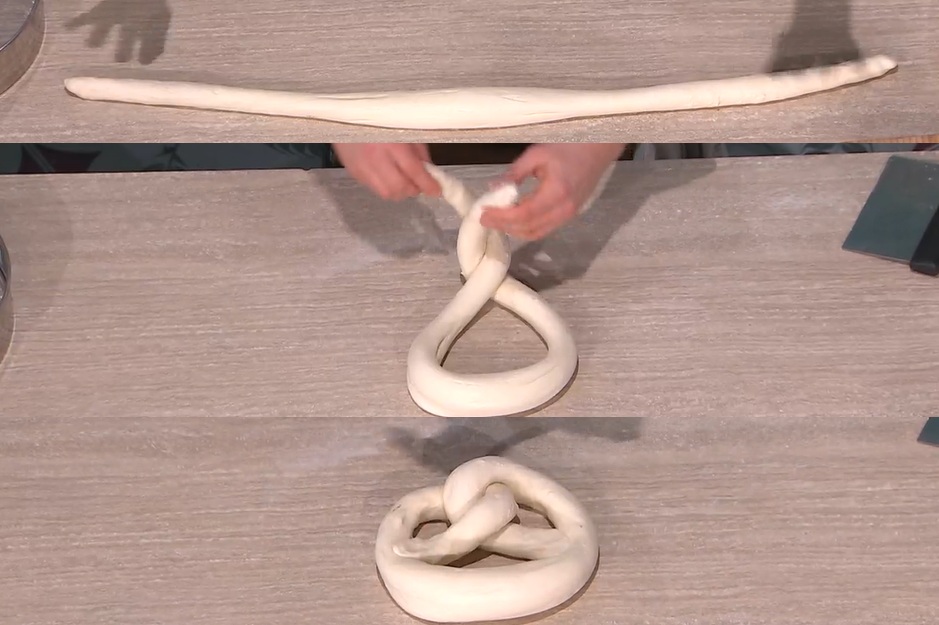 Dividiamo l’impasto in 2 parti. Con le mani, stendiamo una delle metà, creando un salsicciotto che sia leggermente più ‘cicciotto’ al centro. Le intrecciamo, creando il bretzel (foto). Lo posizioniamo su un quadrato di carta forno, copriamo e lasciamo lievitare mezz’ora a temperatura ambiente e mezz’ora in freezer.