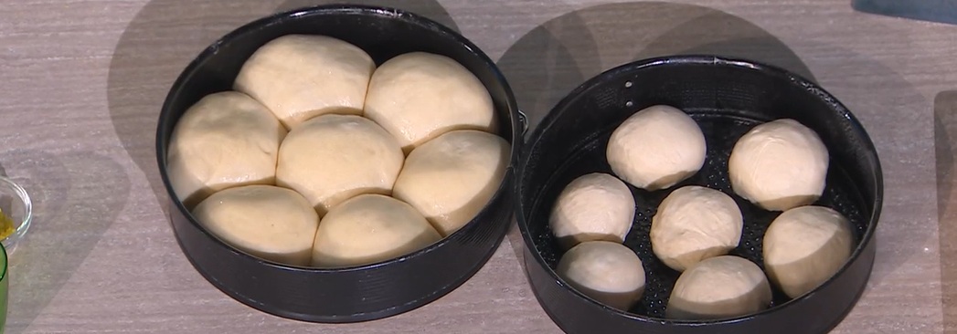 Dividiamo l’impasto in 7 parti uguali, che ripieghiamo su loro stesse, creando 7 sfere lisce. Imburriamo una tortiera e posizioniamo all’interno le palline, distanziate, creando una sorta di fiore. Copriamo e lasciamo lievitare per 2 ore a temperatura ambiente (o fino al raddoppio).