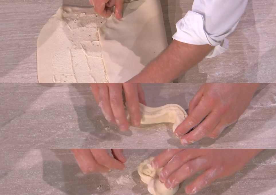Con il mattarello, stendiamo l’impasto ad uno spessore di 3-4 mm, dando la forma di un rettangolo. Spalmiamo sopra il burro a pomata (con l’amido), quindi pieghiamo la sfoglia sul burro, dando una piega a 3. Stendiamo nuovamente con il mattarello, formando un rettangolo lungo circa 30 cm.