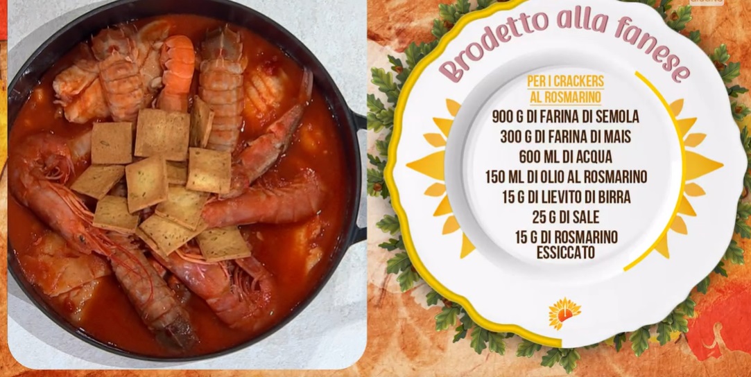 Per i craker, mescoliamo farina di semola e di mais con rosmarino tritato, olio al rosmarino, acqua, quindi uniamo il lievito, impastiamo e infine uniamo il sale. Impastiamo e lasciamo lievitare almeno 2 ore. Stendiamo, ricaviamo dei rettangolini che bucherelliamo con i rebbi di una forchetta e cuociamo in forno a 180° per 15 minuti. Guarniamo la zuppa di pesce con i cracker.