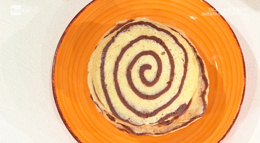 Sulla padella antiaderente ben calda, con una sac a poche, disegniamo una spirale con l’impasto colorato. Coliamo sopra l’impasto chiaro e lasciamo cuocere sui due lati. Serviamo con miele o sciroppo d’acero.