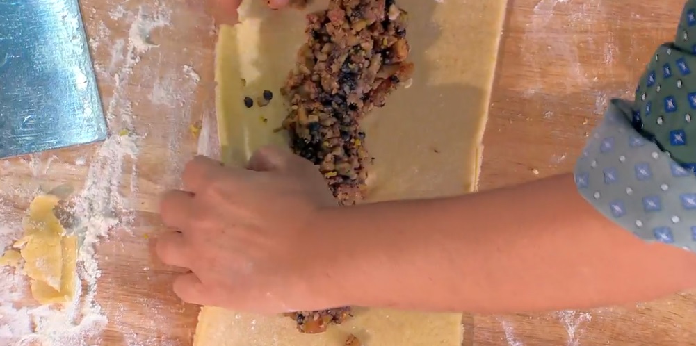 Stendiamo la frolla con il mattarello ad un’altezza di 2-3 mm. Sulla ‘lingua’ di frolla mettiamo un po’ di ripieno e ripieghiamo la frolla sullo stesso, come fosse uno strudel. Tagliamo a trancetti.