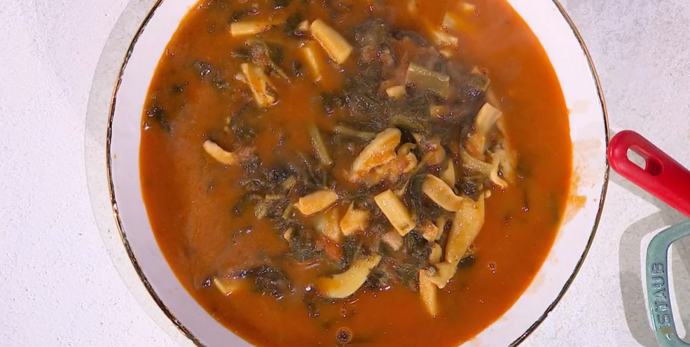 Priviamo le bietole delle coste ed affettiamo la parte verde. La aggiungiamo al resto, in pentola. Copriamo il tutto con mezzo litro di brodo di pesce, copriamo e lasciamo cuocere dolcemente per 1 ora. Serviamo con dei crostini all’aglio.