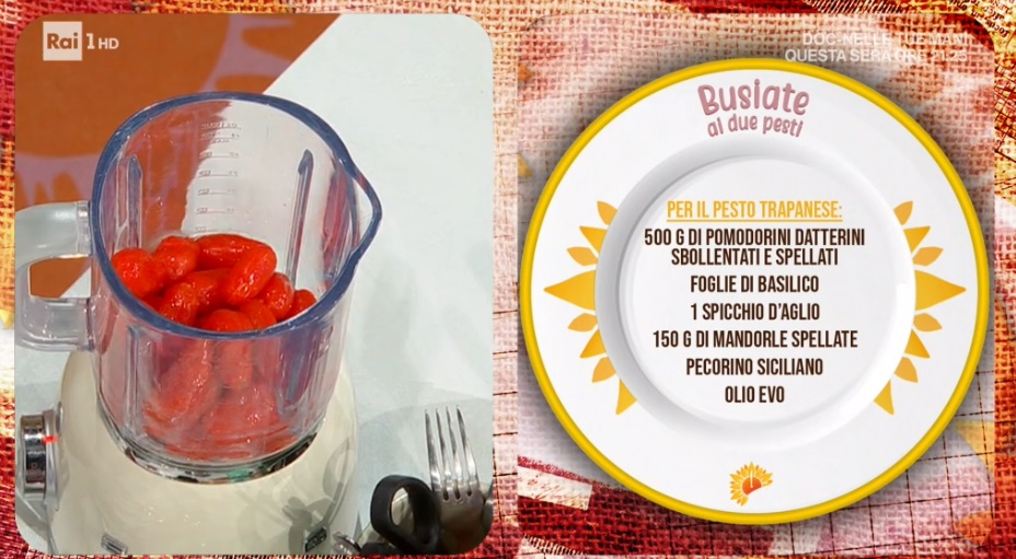 • Pesto trapanese: 500 g pomodorino datterini sbollentati e spellati, foglie di basilico, 1 spicchio d’aglio, 150 g mandorle pelate, pecorino, olio